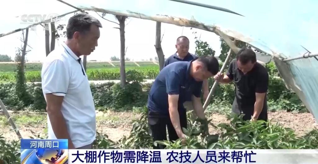在周口市太康县蒋埠口行政村,为了保障大棚作物正常生长,农技人员帮助种植户铺设遮阳网,为农作物喷洒降温剂,最大程度防止农作物高温灼伤。